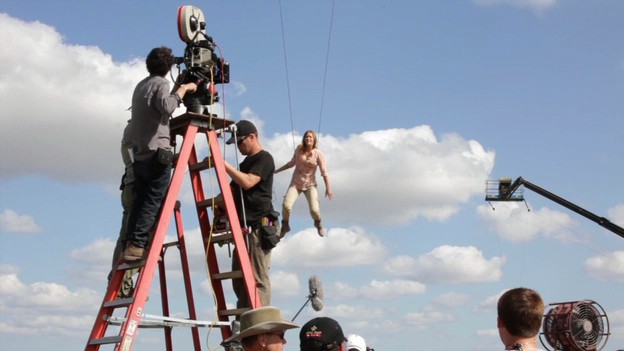 Production filmed Emily Blunt and Bruce Willis suspended from cranes on wires. “This meant that everything that happens effects-wise in the shots is timed according to the original filmed plates,” says Klaus. “Only after the majority of work was done there were then some modifications to some of the actors that were done in comp, including some slight re-timings or re-positionings.”